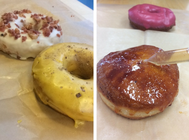 Blue Star Donuts was our first donut stop! We actually went there twice on our trip… We got: Maple Bacon (top left), Passionfruit Cocoa Nib (bottom left), Raspberry Rosemary (top right), and Eggnog Creme Brûlée (bottom right).